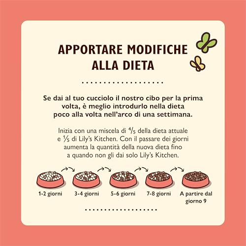 Crocchette Lily’s Kitchen Puppy con Pollo, Salmone e Piselli: alimentazione naturale senza cereali per cuccioli, con proteine di alta qualità, condroprotettori per le ossa, omega 3 e omega 6 per pelle e pelo, più verdure e frutta per un apporto completo di nutrienti.